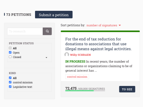 Participants can create collaborative initiatives, define their path and goals, gather endorsements, discuss, debate and disseminate initiatives, set meeting points where signatures can be collected from attendees or debates open to other members of the organisation.