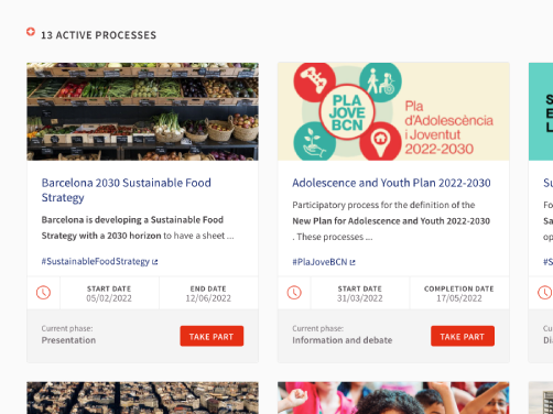 Processes is a space that allows to create, activate/deactivate, and manage various participatory processes. These are distinguished from other spaces by being structured in different phases within which all of the components can be incorporated. Examples of participatory processes are: an election process for members of a committee, participatory budgeting, a strategic planning process, the collaborative writing of a regulation or norm, the design of an urban space or the production of a public policy plan.